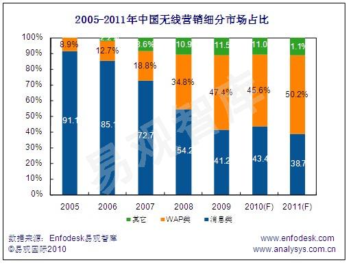 根據(jù)Enfodesk易觀智庫近期發(fā)布《中國無線營銷市場專題報告2010》顯示, 2009年中國無線營銷市場WAP類廣告在無線營銷整體占比達(dá)47.4%,其規(guī)模同比增長76.8%,與消息類廣告同比下跌1.3%相比WAP類廣告,已成為無線營銷市場最大推動力量。
