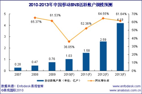 根據(jù)Enfodesk易觀智庫產(chǎn)業(yè)數(shù)據(jù)庫最新發(fā)布的數(shù)據(jù)顯示,到2013年中國移動(dòng)SNS活躍帳戶規(guī)模將達(dá)到4.19億,如下圖所示: