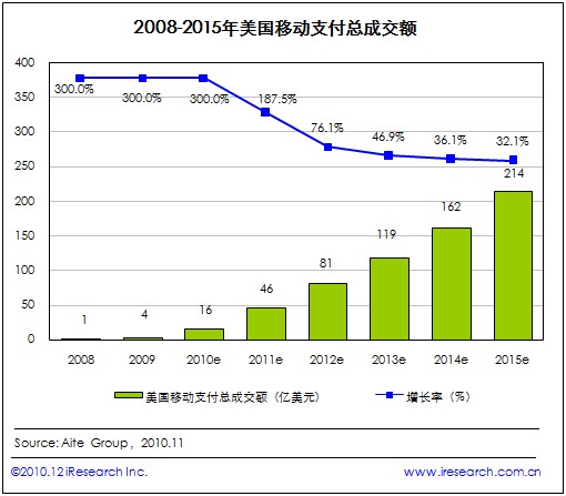 艾瑞咨詢根據(jù)Aite Group發(fā)布的數(shù)據(jù)發(fā)現(xiàn),2010年美國移動支付總成交金額預估值為16億美元,預計2015年這一數(shù)字將攀升至214億美元,將是2010年的13.4倍,復合年增長率為68%。長期以來,美國移動支付總成交額一直處于被低估的狀態(tài),但它的實際表現(xiàn)遠比預想要好很多。其中,2010年到2011年增長率將高達187%。