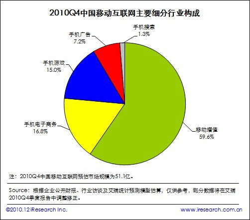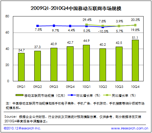 根據(jù)艾瑞咨詢即將發(fā)布的2010年第四季度中國移動互聯(lián)網(wǎng)市場監(jiān)測數(shù)據(jù)顯示,2010Q4中國移動互聯(lián)網(wǎng)市場整體規(guī)模達(dá)到51.1億,同比增長19.8%,環(huán)比增長20.3%。艾瑞咨詢分析認(rèn)為,本季度電信運(yùn)營商對計(jì)費(fèi)通道治理開始收尾,移動增值市場整體復(fù)蘇。同時手機(jī)電子商務(wù)、手機(jī)游戲業(yè)務(wù)領(lǐng)域取得良好市場表現(xiàn),受手機(jī)應(yīng)用商店、位置簽到服務(wù)等新型手機(jī)業(yè)務(wù)創(chuàng)新的帶動,移動互聯(lián)網(wǎng)規(guī)模總體攀升,投融資比重增加。