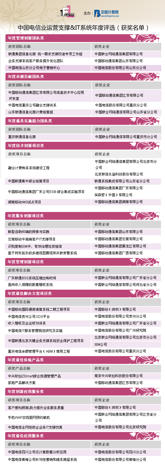 由中國計費網(wǎng)(www.billingchina.com)主辦的“Awards2010”第四屆中國電信業(yè)運營支撐&IT系統(tǒng)年度評選活動的結(jié)果于2011年元月31日隆重揭曉。自2010年12月1日評選活動正式啟動以來,歷時兩個月,來自國內(nèi)運營商集團、省級公司、IT產(chǎn)品與服務(wù)提供商的42家企業(yè)的優(yōu)秀產(chǎn)品、項目和團隊共計70份參評項目入圍評選。經(jīng)過全面征集、選拔、初審以及評委團的嚴格評審,評選結(jié)果已經(jīng)公示。在30位來自運營商IT支撐、業(yè)務(wù)和服務(wù)部門的威權(quán)評委們的認真評審后,共有27家企業(yè)分別獲得了30個Awards2010的團隊/項目/產(chǎn)品/應(yīng)用服務(wù)的榮譽桂冠。