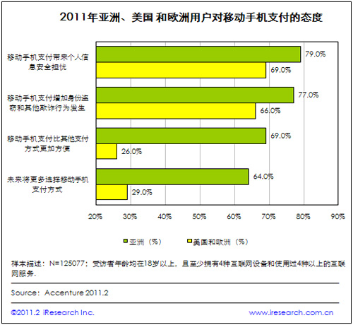 iResearch艾瑞咨詢根據(jù)Accenture的研究調(diào)查數(shù)據(jù)發(fā)現(xiàn),移動(dòng)手機(jī)支付安全問題受到全球用戶的普遍關(guān)心。根據(jù)2011年Accenture對亞洲、美國以及歐洲125077位手機(jī)用戶進(jìn)行的網(wǎng)上調(diào)查顯示,亞洲79%的受訪者擔(dān)心移動(dòng)手機(jī)支付帶來的個(gè)人信息安全隱患,77%的受訪者擔(dān)心身份盜竊和其他欺詐行為的發(fā)生;美國和歐洲擔(dān)心以上安全問題的用戶也分別占到69%和66%。