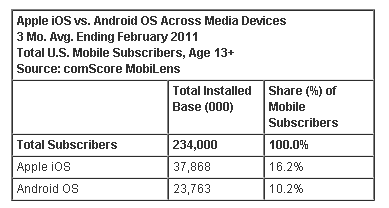 新的ComScore數(shù)據(jù)顯示,統(tǒng)計(jì)所有的移動(dòng)通信設(shè)備,包括手機(jī)、平板電腦、iPodTouch等,蘋果iOS平臺(tái)在美國(guó)遠(yuǎn)超Android59%。換句話說,蘋果16.2%的移動(dòng)設(shè)備市場(chǎng)份額超過了Android的10.2%。