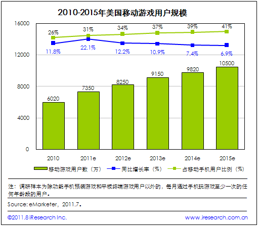 iResearch艾瑞咨詢根據(jù)eMarketer最新發(fā)布數(shù)據(jù)發(fā)現(xiàn),2010年美國(guó)移動(dòng)游戲用戶規(guī)模為6020萬(wàn)人,同比增長(zhǎng)11.8%,占美國(guó)移動(dòng)手機(jī)用戶比例為26%;預(yù)計(jì)未來(lái)五年內(nèi),用戶規(guī)模將保持持續(xù)增長(zhǎng)勢(shì)態(tài),2011年將出現(xiàn)一個(gè)較高的增長(zhǎng)點(diǎn),移動(dòng)游戲用戶數(shù)將達(dá)到7350萬(wàn)人,同比增長(zhǎng)22.1%,在移動(dòng)手機(jī)用戶中的滲透率達(dá)31%;之后增長(zhǎng)將逐漸趨緩,到2015年用戶規(guī)模將突破一億,達(dá)到1.05億,同比增長(zhǎng)率降為6.9%,滲透率達(dá)41%。