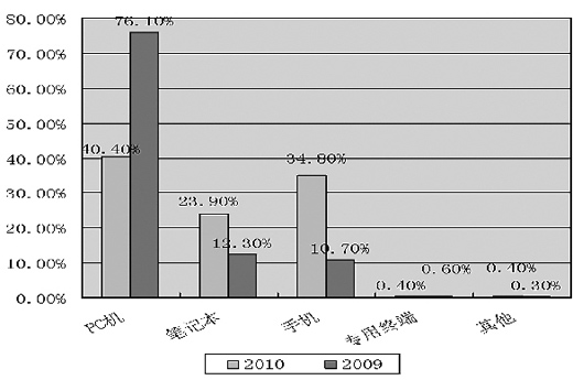 以手機(jī)為閱讀載體的比例從2009年的10.7%激增到2010年的34.8%。相比之下,PC機(jī)閱讀則出現(xiàn)了大幅度地滑落,從2009年的76.1%下降到2010年的40.4%?梢,大部分通過PC機(jī)閱讀的讀者更加傾向或習(xí)慣于手機(jī)閱讀。