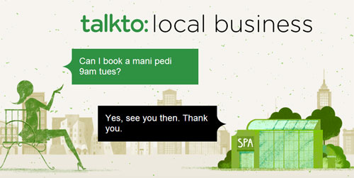 這一切是怎樣實現(xiàn)的呢?TalkTo通過短信與商家溝通。用戶可以通過web應(yīng)用在TalkTo目錄中搜索需要的服務(wù),輸入商家的詳細(xì)地址或者大概位置,TalkTo就可以確保商家看到用戶的短信。TalkTo用戶可以向商家提出問題和意見,或直接預(yù)定服務(wù)!斑@一切就像和朋友發(fā)短信一樣簡單!