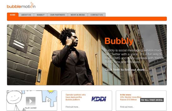 “Bubble Motion”的Bubbly平臺是一個手機端的語音微博服務,允許用戶通過聲音向他們的關(guān)注者和粉絲發(fā)布狀態(tài)信息,模式與Twitter一樣,只是將文字變成了聲音,微博變成了bubbles,用戶將錄制的聲音更新到手機,然后所有粉絲將收到一條短信通知,點擊短信內(nèi)的鏈接就可以收聽。