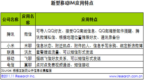 新型移動IM(米聊、微信等)建立在手機通訊錄的基礎(chǔ)上,較以往移動QQ、飛信等具有更強的用戶粘性,并且克服了傳統(tǒng)移動IM需要反復登錄、只能發(fā)送文字、圖片等缺點。