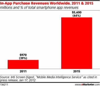 IHS Screen Digest預(yù)計,應(yīng)用內(nèi)置支付將成為移動應(yīng)用營收的新標(biāo)準(zhǔn)。游戲開發(fā)商共同通過向用戶提供免費(fèi)應(yīng)用下載服務(wù),然后向用戶進(jìn)入新層次內(nèi)容收取費(fèi)用已證明這種“免費(fèi)增值”模式非常的成功。IHS Screen Digest預(yù)計,到2015年,應(yīng)用內(nèi)置支付將占據(jù)智能手機(jī)應(yīng)用營收總額的64%,遠(yuǎn)超過2011年的39%。