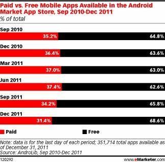 通過對2010年9月至2011年12月Android Market應(yīng)用商店的分析,進(jìn)一步表明了對免費(fèi)應(yīng)用模式的依賴性。根據(jù)第三方應(yīng)用程序跟蹤服務(wù)AndroLib提供的數(shù)據(jù),2010年9月Android Market應(yīng)用商店下載的大約65%應(yīng)用均為免費(fèi)應(yīng)用;在2011年12月,這一比例已經(jīng)提升至69%。