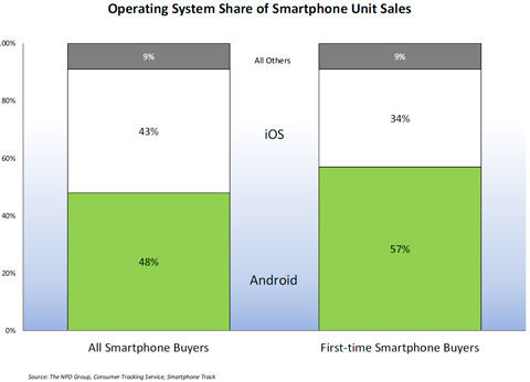 Android和iPhone一共占據(jù)了第四季度智能手機銷售總量的90%。Android在四季度依舊保持了48%的智能手機市場份額,同時Android設備在首次購買智能手機的消費者群中表現(xiàn)更好。根據(jù)NPD每月提供的Smartphone Track服務的最新數(shù)據(jù),所有在第四季度初次購買智能手機的消費者中,其中57%的消費者選擇了Android設備,而相比較下只有34%的消費者選擇了iPhone。