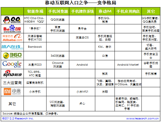 2012年,移動互聯(lián)網“入口之爭”仍將繼續(xù),隨著移動終端的普及,用戶數量和流量都將快速增長,各企業(yè)的核心策略仍以用戶數和流量為主,并在此基礎上開始探索商業(yè)模式,并開始布局整個生態(tài)系統(tǒng)?梢灶A見,下一步的競爭將蔓延到更具體的應用類型上,但是互聯(lián)網企業(yè)的參與度不會像入口型應用這么高,投資和兼并事件將有所增加。