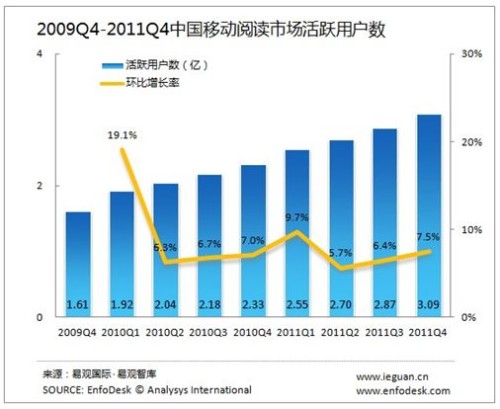 2011年第4季度中國(guó)手機(jī)閱讀活躍用戶(hù)突破3億