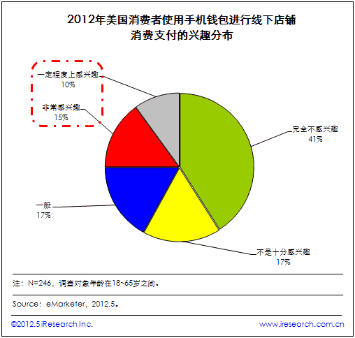 iResearch艾瑞咨詢整理eMarketer調(diào)查數(shù)據(jù)發(fā)現(xiàn),盡管手機(jī)支付市場增速迅猛,但其在美國消費(fèi)者中的接受程度相對(duì)較低。數(shù)據(jù)顯示,被調(diào)查者中只有1/4的美國用戶對(duì)使用手機(jī)錢包在線下店鋪消費(fèi)感興趣,而相比之下,58%的消費(fèi)者對(duì)手機(jī)錢包技術(shù)不感興趣,其中包括41%的人完全沒興趣。