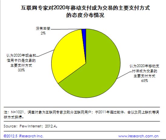 CTI論壇(ctiforum)6月13日消息(記者 楊佳林):據(jù)iResearch艾瑞咨詢整理Pew Internet調查數(shù)據(jù)發(fā)現(xiàn),多數(shù)互聯(lián)網(wǎng)專家認為2020年移動支付將取代現(xiàn)金和信用卡成為主流支付方式。其中,65%的受訪專家認為到2020年,大多數(shù)消費者將采用智能刷卡終端進行支付;然而33%的專家不贊成這種推測,他們認為到2020年,現(xiàn)金和信用卡將仍然是主要的支付方式,消費者對NFC技術安全性的擔憂及主要貨幣電子轉換技術的限制會阻礙移動支付的進一步發(fā)展。