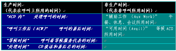 如果工作狀態(tài)最佳,代表的工作目標(biāo)為80%的時間用在呼叫上,其余為非生產(chǎn)時間。主管運(yùn)用ACD報告結(jié)合第一手調(diào)查資料考察這些工作所用的時間。