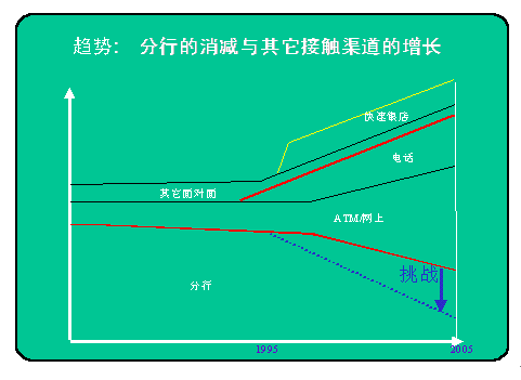 。。下圖為國(guó)外專家對(duì)銀行不同客戶服務(wù)渠道發(fā)展比例的說(shuō)明?梢钥吹,營(yíng)業(yè)廳的比例在逐年下降,而國(guó)外不少銀行甚至將進(jìn)一步壓縮營(yíng)業(yè)廳比例作為一項(xiàng)渠道的任務(wù)。電話銀行也就是通過(guò)IVR實(shí)現(xiàn)的自助服務(wù),自然是呼叫中心的一部分,但人工服務(wù),包括對(duì)上網(wǎng)及其它互動(dòng)方式的客戶提供的座席代表服務(wù),當(dāng)然更是現(xiàn)代呼叫中心業(yè)務(wù)的一部分,圖上雙紅線內(nèi)所表示的正是不斷發(fā)展的呼叫中心的所占比例。