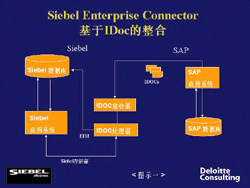在這個名為Siebel Enterprise Connector的中間軟件中,這種整合通過兩個方法來實現(xiàn)。一是通過中間文件(Intermediate Document IDoc)實現(xiàn)的整合(圖示一),它可以把SAP中的基本信息輸入到Siebel中,其中IDocs接收器接收從SAP服務(wù)器中存儲的關(guān)于客戶戶口、聯(lián)系人、產(chǎn)品和價格等信息,然后把這些信息存入IDocs界面中,這個界面是Siebel的整合管理(Enterprise Integration Manager,EIM)的一部分,于是這些信息就可以完全傳入到Siebel中。這樣的整合不僅在CRM最初啟動的時候可以用來進(jìn)行數(shù)據(jù)轉(zhuǎn)化,而且在ERP和CRM的同步運行中還能不斷地把最新調(diào)整的產(chǎn)品目錄、價格和折扣等信息輸入到前端軟件中,讓銷售人員可以及時地給出正確的報價。