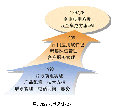 ----二是CRM的技術逐漸走向成熟(見圖1)。1990年左右,CRM方案只是片斷功能的實現,到1995年以來、1997/8年以來,逐漸出現了部門級應用軟件包、企業(yè)級應用方案。有些企業(yè)甚至已經開始關心自己原有的ERP系統(tǒng)與正在建設的CRM系統(tǒng)之間的集成問題。