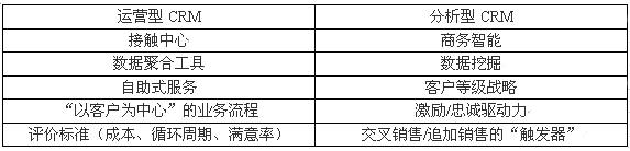 一般情況下CRM的可分為兩大類:即運營型CRM和分析型CRM。(有時把"協(xié)作型CRM"單獨作為一類)。多數(shù)情況之下運營型CRM引用的是產品,服務和一個企業(yè)實際能夠"照料"客戶的運做能力。關系中心,數(shù)據(jù)集合系統(tǒng)及Web站點僅僅是一些例子。分析型CRM主要指用來推動"以客戶為中心"的戰(zhàn)略和工具。商務智能系統(tǒng),數(shù)據(jù)挖掘工具及客戶層級戰(zhàn)略都可以算在這個范疇之內。