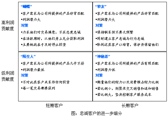 CRM廠商和業(yè)界普遍認(rèn)為:只要贏得了客戶的忠誠,企業(yè)將"財源滾滾";因此企業(yè)在培養(yǎng)客戶忠誠方面的開支在逐步上升。因為從表面上看來,客戶滿意度、客戶忠誠度和客戶保留度越高,客戶利潤貢獻度就大。但事實并不如他們所愿,《哈佛商業(yè)評論》最新的論文,研究表明:客戶滿意度、客戶忠誠度與客戶利潤貢獻度的關(guān)聯(lián)程度比預(yù)期的要小得多。企業(yè)應(yīng)當(dāng)對忠誠客戶再進行細(xì)分,然后在更細(xì)化的客戶基礎(chǔ)上對其進行分類管理,并采取相應(yīng)的對策。在論文中,作者根據(jù)利潤貢獻度大小與客戶的短長期兩個維度,將忠誠客戶進行了深層次細(xì)分。主要分成四類:"蝴蝶"、"摯友"、"陌生人"、"神秘者"。企業(yè)應(yīng)該根據(jù)每一類的情況采取相應(yīng)的對策。管理那些能使企業(yè)盈利但不忠誠的客戶--"蝴蝶"--的關(guān)鍵是,在他們購物時盡可能地從他們身上獲利。對那些既能帶來利潤又忠誠的客戶--"摯友",細(xì)心呵護他們則更為恰當(dāng)。至于那些忠誠但不能帶來利潤的客戶--"藤壺",你需要做的是確定他們是否有增加消費的潛力。最后,對于"陌生人"--那些既不忠誠又沒有利潤可賺的客戶,答案當(dāng)然很簡單:早點認(rèn)出他們,不對他們做任何投資。