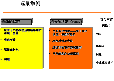 在評(píng)估當(dāng)前情況與遠(yuǎn)景,資源需求,癥結(jié),極限以及鋪就路標(biāo)和里程碑的關(guān)系時(shí),實(shí)施展望和差距分析會(huì)議是十分重要的。取決于你對(duì)CRM遠(yuǎn)景的定義——無論是它將成為一個(gè)能夠給你一把競(jìng)爭(zhēng)利刃的企業(yè)策略 (類似的例子有Citicorp,Dell,F(xiàn)ord Motors) 或僅僅只是一個(gè)讓你更出眾的營銷項(xiàng)目——這邁出的第一步在你選擇CRM方法論的過程中都必將起到舉足輕重的作用。一個(gè)核心的方法論必須能夠支持企業(yè)大部分的業(yè)務(wù)和流程需求,如MIS;客戶體驗(yàn)管理;接觸點(diǎn)管理;收益率管理等等。
