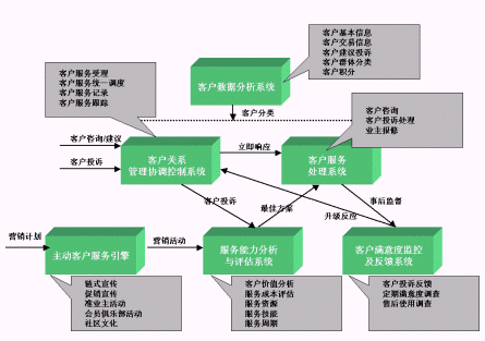 目的是保證和提高客戶服務(wù)的工作效率與質(zhì)量水平。例如,當(dāng)客戶滿意度監(jiān)測與反饋系統(tǒng)將客戶信息反饋給協(xié)調(diào)控制系統(tǒng)后,后者立刻要求客戶盈利能力評估系統(tǒng)進行評估,并提出最佳方案,然后向客戶服務(wù)處理系統(tǒng)發(fā)出指令,由它進行實施。