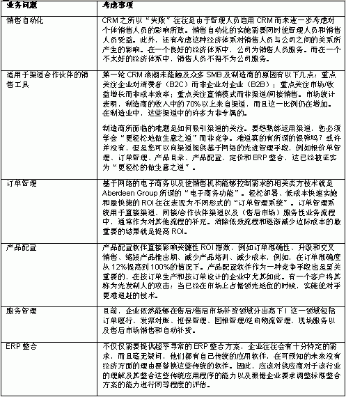對(duì)于包括生產(chǎn)行業(yè)在內(nèi)的許多垂直行業(yè)而言,CRM 技術(shù)不再是只有 SMB 可以享用的稀有解決方案,現(xiàn)在這些企業(yè)也要求進(jìn)行此類投資,以便與競(jìng)爭(zhēng)對(duì)手一爭(zhēng)高下。許多 SMB 已經(jīng)實(shí)施 CRM 方案,減少銷售與服務(wù)成本,提高銷售效率,并提高客戶滿意度。問(wèn)題的關(guān)鍵是要慎重選擇解決方案。您選擇的解決方案應(yīng)該為您的企業(yè)增加價(jià)值,從長(zhǎng)遠(yuǎn)來(lái)看,您需要一個(gè)能夠提供集成式端到端解決方案的業(yè)務(wù)合作伙伴,而且其解決方案要符合您在預(yù)算和利益方面的要求。