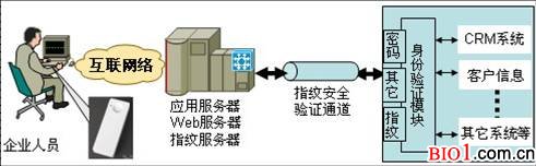 基于生物識別技術的CRM指紋身份認證系統(tǒng)應用模式如下: