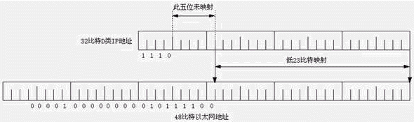 D類地址的最后28比特沒(méi)有結(jié)構(gòu)化,即沒(méi)有網(wǎng)絡(luò)ID和主機(jī)ID之分。響應(yīng)某一個(gè)IP多播地址的主機(jī)構(gòu)成一個(gè)主機(jī)組,主機(jī)組可跨越多個(gè)網(wǎng)絡(luò)。主機(jī)組的成員數(shù)是動(dòng)態(tài)的,主機(jī)可以通過(guò)IGMP協(xié)議加入或離開某個(gè)主機(jī)組。IP多播地址影射到以太網(wǎng)地址的方法見下圖。因?yàn)镮P多播地址的高5位未影射,因此,影射的以太網(wǎng)地址不是唯一的,共有32個(gè)IP多播地址影射到一個(gè)以太網(wǎng)地址。