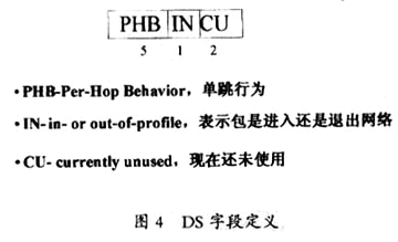 Diff-Serv比Int-Serv 更具可擴展性,如圖3所示,它可用于企業(yè)的廣域網(wǎng)中,并在運營商網(wǎng)絡中發(fā)揮重要的作用,因為它可以根據(jù)應用或業(yè)務類型排出不同的優(yōu)先級別。業(yè)務區(qū)分結構使用IPv4報頭中的業(yè)務類型(ToS)字段,并將8 位ToS字段重新命名,作為DS字段,其中6位可供目前使用,剩余2位以備將來使用,如圖4所示。通過該字段的標記,下行節(jié)點可以獲取足夠的服務質(zhì)量信息,以對到達該端口的數(shù)據(jù)包做出相應的“處理”,將它們正確地轉發(fā)給下一跳的路由器。這里需要注意, ToS字段和DS字段的定義是不同的。邊緣路由器可以將ToS字段映射到DS字段。
