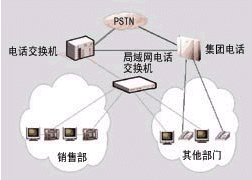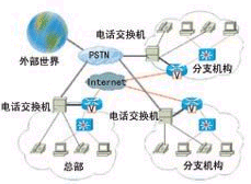 目前,大多數(shù)大型企業(yè)與分支機構(gòu)的電話和計算機網(wǎng)絡(luò)是相互獨立的,分處各地的辦公機構(gòu)建有局域網(wǎng),局域網(wǎng)之間通過Internet或企業(yè)專網(wǎng)互連,企業(yè)的數(shù)據(jù)業(yè)務(wù)通過計算機網(wǎng)絡(luò)傳輸。而各辦公機構(gòu)的電話網(wǎng)則采用傳統(tǒng)的電話交換機或集團電話,內(nèi)部員工之間相互是分機撥號,電話交換機接入電信電話公網(wǎng),與外部的語音交流需要通過本地電話網(wǎng)或長途電話網(wǎng)。