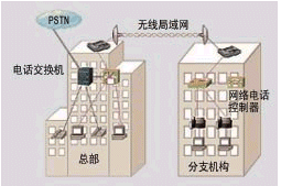 如圖2所示,兩個辦公樓之間距離較遠(yuǎn),不方便布線,其計算機網(wǎng)絡(luò)可以通過無線局域網(wǎng)來連接。在總部已有電話交換機系統(tǒng),這時只需在分支機構(gòu)中增加Cisco網(wǎng)絡(luò)電話控制器,布署IP電話機,然后通過總部帶語音模塊的Cisco路由器或交換機,接入總部的電話交換機,分支機構(gòu)就可以享用總部的電話中繼線路,與總部一樣自由地使用電話系統(tǒng)。