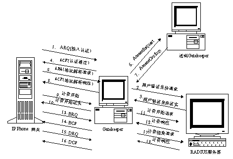 2、用戶認(rèn)證:網(wǎng)關(guān)用ARQ把用戶卡號和密碼發(fā)給網(wǎng)守,網(wǎng)守再把卡號和密碼送給計費(fèi)認(rèn)證中心,如果計費(fèi)認(rèn)證中心認(rèn)證通過,網(wǎng)守向網(wǎng)關(guān)發(fā)ACF,否則回ARJ。