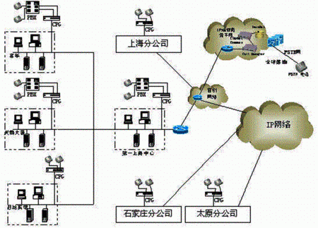 方案中VoIP的應用是比較典型的,同時也有比較特殊的地方:溫州、石家莊等地區(qū)沒有被首創(chuàng)網絡覆蓋到,而客戶仍想采用IP電話方式,據此首創(chuàng)網絡提出了部分通過公網Internet傳輸數據的個性化方案以滿足客戶的需求。