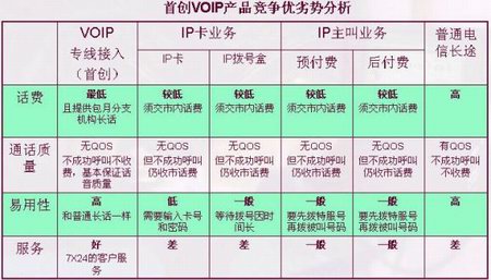 比業(yè)內其他多種IP電話更具價格優(yōu)勢。每個長途呼叫無論是否建立成功,都不收取本地市話費用。對于國內目前話務量集中的國際間通信,采用的資費標準相對其他運營商具有價格優(yōu)勢。對于企業(yè)的Intranet Call,由于企業(yè)間不產生話費,更能夠節(jié)省大量的話務開支。