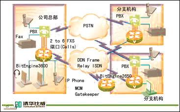 利用清華比威BitEngine系列路由器產(chǎn)品提供的VoIP(Voice over IP)支持,以及該產(chǎn)品具有的安全、加密、QoS、路由等特性,通過將長話旁路到數(shù)據(jù)網(wǎng)上,為企業(yè)節(jié)省大量的長話費(fèi)用開銷,同時利用豐富的接口,同原有的交換機(jī)相連,有效保護(hù)了企業(yè)原先的投資繼續(xù)有效。本方案中,使用清華比威的BitEngine2650/3600路由器實(shí)現(xiàn)企業(yè)間數(shù)據(jù)業(yè)務(wù)和語音業(yè)務(wù)的融合,BitEngine系列路由器提供了完善的QoS保證機(jī)制(支持PQ/WFQ/CBWFQ/WRED等多種隊(duì)列方式),確保語音數(shù)據(jù)的優(yōu)先處理。
