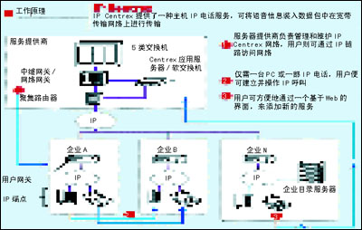 IP Centrex包含了大量能向企業(yè)提供語音業(yè)務(wù)的IP電話服務(wù),他可將呼叫裝入數(shù)據(jù)包中在寬帶傳輸網(wǎng)絡(luò)上傳送,而一個寬帶傳輸網(wǎng)絡(luò)可被用來承載多個呼叫的語音數(shù)據(jù)。在工作時,如果某個呼叫還沒有激活,那么將會有更多的帶寬分配到高速數(shù)據(jù)會話中(high-speed