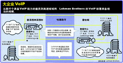 Lehman Brothers利用Cisco CallManager IP PBX向全球的雇員提供語音服務(wù)。該公司的IP PBX位于公司在曼哈頓和新澤西城的冗余數(shù)據(jù)中心內(nèi)。公司從2001年初先期部署了容量為50部電話的VoIP網(wǎng)絡(luò)。該系統(tǒng)在當(dāng)年年中時(shí)已經(jīng)增容至1000個(gè)用戶。目前,這套VoIP網(wǎng)絡(luò)已經(jīng)增加至8000個(gè)IP電話,用戶遍及紐約地區(qū)、英國和日本。該公司負(fù)責(zé)網(wǎng)絡(luò)服務(wù)的副總裁John