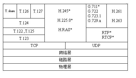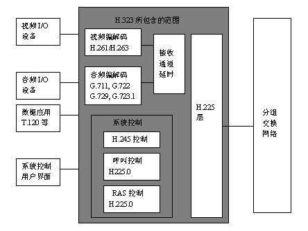 為網(wǎng)絡(luò)電話(huà)和可視電話(huà)會(huì)議系統(tǒng)的進(jìn)一步發(fā)展和系統(tǒng)的兼容性提供了良好的條件。其中系統(tǒng)控制協(xié)議包括H.323、H.245、和H.225.0,Q.931和RTP/RTCP是H.225.0的主要組成部份。系統(tǒng)控制是H.323終端的核心。整個(gè)系統(tǒng)控制由H.245控制信道、H.225.0呼叫信令信道和RAS(注冊(cè)、許可、狀態(tài))信道提供,音頻編解碼協(xié)議包括G.711協(xié)議(必選)、G.722、G.723.1、G.728、G.729等協(xié)議。編碼器使用的音頻標(biāo)準(zhǔn)必須由H.245協(xié)議協(xié)商確定。H.323終端應(yīng)由對(duì)本身所具有的音頻編解碼能力進(jìn)行非對(duì)稱(chēng)操作。如以G.711發(fā)送,以G.729接收。視頻編解碼協(xié)議主要包括H.261協(xié)議(必選)和H.263協(xié)議。H.323系統(tǒng)中視頻功能是可選的。數(shù)據(jù)會(huì)議功能也是可選的,其標(biāo)準(zhǔn)是多媒體會(huì)議數(shù)據(jù)協(xié)議T.120。其結(jié)構(gòu)如圖所示。