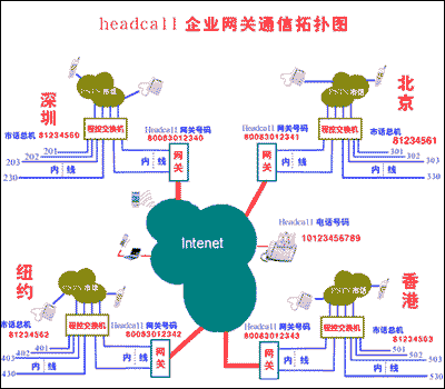 下面是集團(tuán)用戶利用HeadCall的語音網(wǎng)關(guān)的通訊拓樸圖: