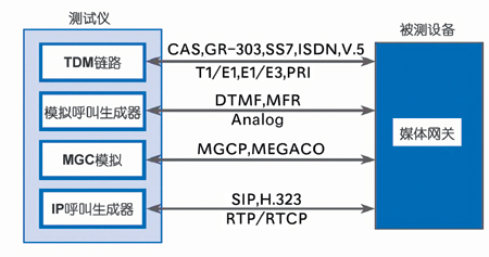 我們按照VoIP組網(wǎng)的原理,構(gòu)建了這樣一個基本網(wǎng)絡(luò),其網(wǎng)絡(luò)結(jié)構(gòu)如圖4所示。我們用軟交換的概念來描述網(wǎng)絡(luò)上的設(shè)備,在這個網(wǎng)絡(luò)上,MG(媒體網(wǎng)關(guān))和MGC(媒體網(wǎng)關(guān)控制器)是關(guān)鍵的VoIP網(wǎng)絡(luò)元素。這些網(wǎng)絡(luò)元素可以是支持H.323、MGCP、H.248或者SIP的實體。本文中提到的MG和MGC不具體指某一個設(shè)備,本次測試正是針對這兩類設(shè)備進行,測試的主要內(nèi)容也圍繞著這兩類設(shè)備展開。測試從模擬話音開始,然后延伸到PSTN網(wǎng)絡(luò),再到IP網(wǎng)絡(luò),最后回到模擬話機的被叫方。在這樣一個完整通話過程中,測試MG以及MGC的信令互操作性以及設(shè)備處理信令的能力。圖5是測試系統(tǒng)結(jié)構(gòu)原理圖。