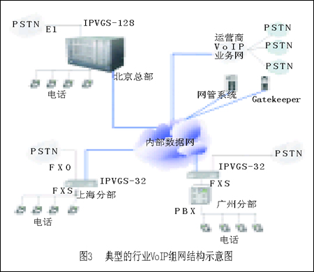 我國現(xiàn)有很多擁有自己專網(wǎng)的行業(yè),比如金融、能源和一些政府機構,它們正是通過這樣的方案來實現(xiàn)內(nèi)部通話的。這些行業(yè)目前也正是中國VoIP市場的主力,由于行業(yè)用戶的規(guī)模很大,目前中國的很多行業(yè)實際上都有一套運營級的VoIP網(wǎng)絡。圖3是一個典型的行業(yè)VoIP組網(wǎng)結構圖。