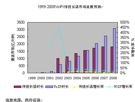 2000年以來,IP長話憑借明顯的資費(fèi)優(yōu)勢,對傳統(tǒng)長話形成了有力的競爭,在通話量上已趕超了傳統(tǒng)長話。也正是由于IP長話的低資費(fèi),在其通話量大幅度增加的同時(shí),也導(dǎo)致了國內(nèi)長話網(wǎng)總體收入的下降,長途電話IP化的趨勢十分明顯?傮w而言,中國VoIP市場仍蘊(yùn)藏著非常大的潛力,按照3G和NGN的部署速度,