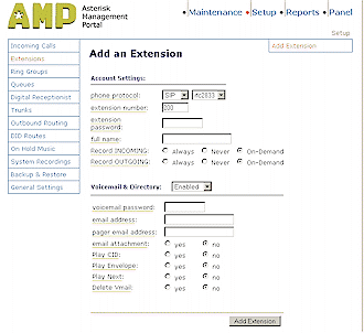 設(shè)置好中繼后,現(xiàn)在AAH就與你的VoIP服務(wù)提供商建立好連接了,接下來(lái)就是使用“Add an Extension”頁(yè)面(圖5)來(lái)設(shè)置你的電話了,每一個(gè)Extensions選項(xiàng)必需指定一個(gè)名字、數(shù)字和密碼,還可隨意給它指定一個(gè)語(yǔ)音信箱的目錄。