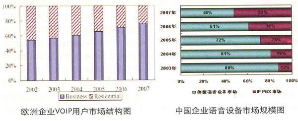 相關(guān)數(shù)據(jù)顯示,企業(yè)級VOIP的市場規(guī)模將以超過40%的年復合增長率增長,2010年前仍將占據(jù)整個VOIP市場的50%以上。從“歐洲VOIP用戶市場結(jié)構(gòu)圖”來看,企業(yè)VOIP用戶的占比在逐年提升,2007年可達到70%左右。全球企業(yè)VOIP的設備銷售形勢也是一片大好,Juniper Research最新發(fā)表的研究報告稱,2007年企業(yè)VOIP設備市場的銷售收入將達到55億美元。