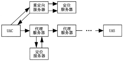 如圖2所示,SIP網(wǎng)絡(luò)采用IP網(wǎng)絡(luò)常用的客戶機(jī)/服務(wù)器(C/S)結(jié)構(gòu),定義了若干種不同的服務(wù)器和用戶代理,通過與服務(wù)器之間的請求和響應(yīng)完成呼叫和傳送層的控制。