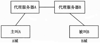 圖3給出了上述SIP消息選路過程。主叫A接入A域的代理服務(wù)器A后,代理服務(wù)器A查詢DNS,得到B域的代理服務(wù)器B的地址。最后由代理服務(wù)器B將invite消息發(fā)送至被叫B。在軟交換網(wǎng)絡(luò)中,代理服務(wù)器A和代理服務(wù)器B的功能都由軟交換機(jī)實(shí)現(xiàn)。