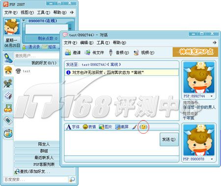 P5P和酷寶很類似,不過它沒有集成MSN,僅是在界面上模仿MSN,文本聊天框就是MSN翻版,MSN經(jīng)典的閃屏震動功能也有。P5P還在在好友列表上加進(jìn)了一些QQ的元素。