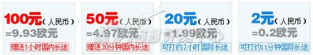 在skype的資費(fèi)列表中,沒有人民幣選項(xiàng),在Tom-Skype的充值選項(xiàng)中,僅提供了四種金額的充值100、50、20、和2元。從官方站點(diǎn)查到的價格為0.017歐元/分鐘(約合人民幣0.17元/分鐘)